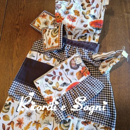 Il color senape predominante in questo bellissimo grembiule romantico non toglie freschezza alla fantasia della cotonina che arricchisce il grembiule stesso.