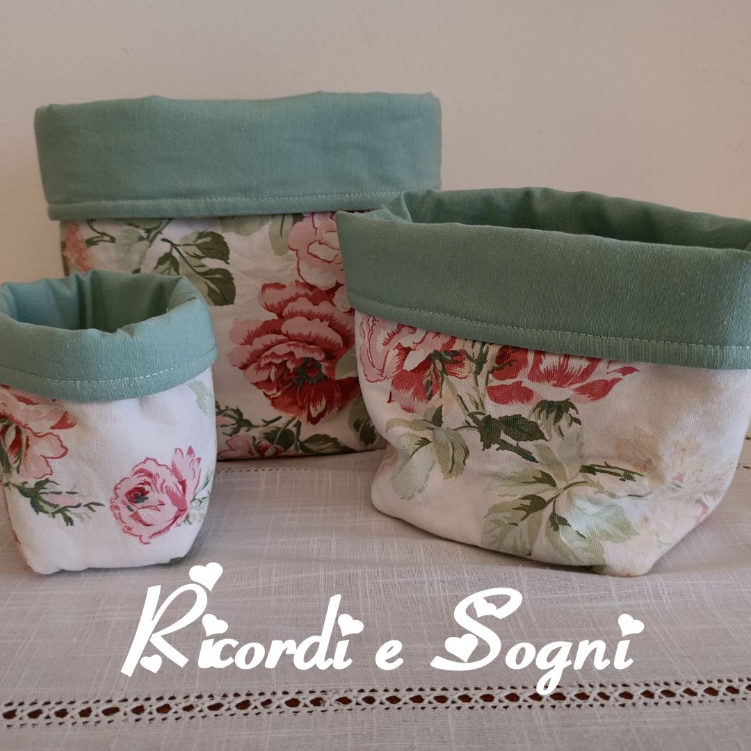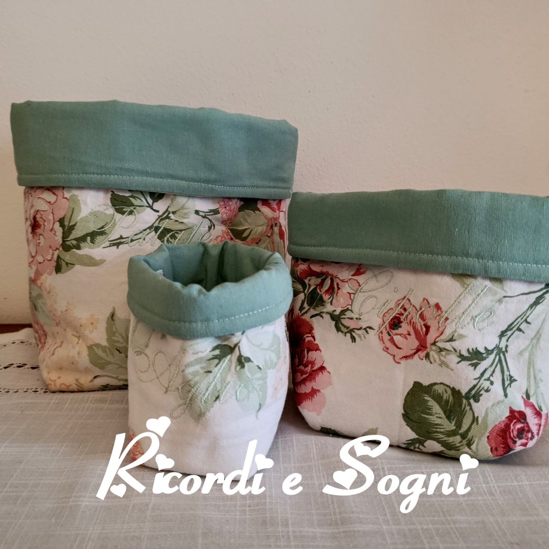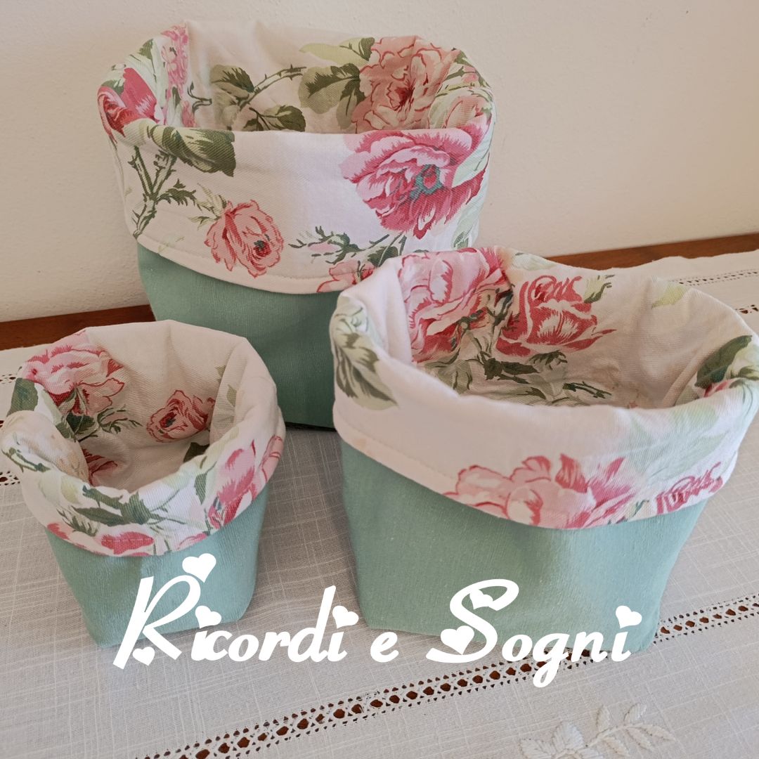 Tre cestini dedicati a patate, cipolle ed aglio. L’esterno è in panamino di cotone fantasia, l’interno in misto cotone color verde acqua. Imbottitura sintetica, delicatissimi i ricami.