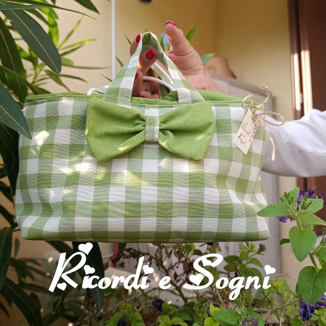 Esterno in misto cotone a quadri bianco e verde. Interno e coulisse in misto cotone verde. Imbottitura sintetica. Fiocco verde rimovibile.