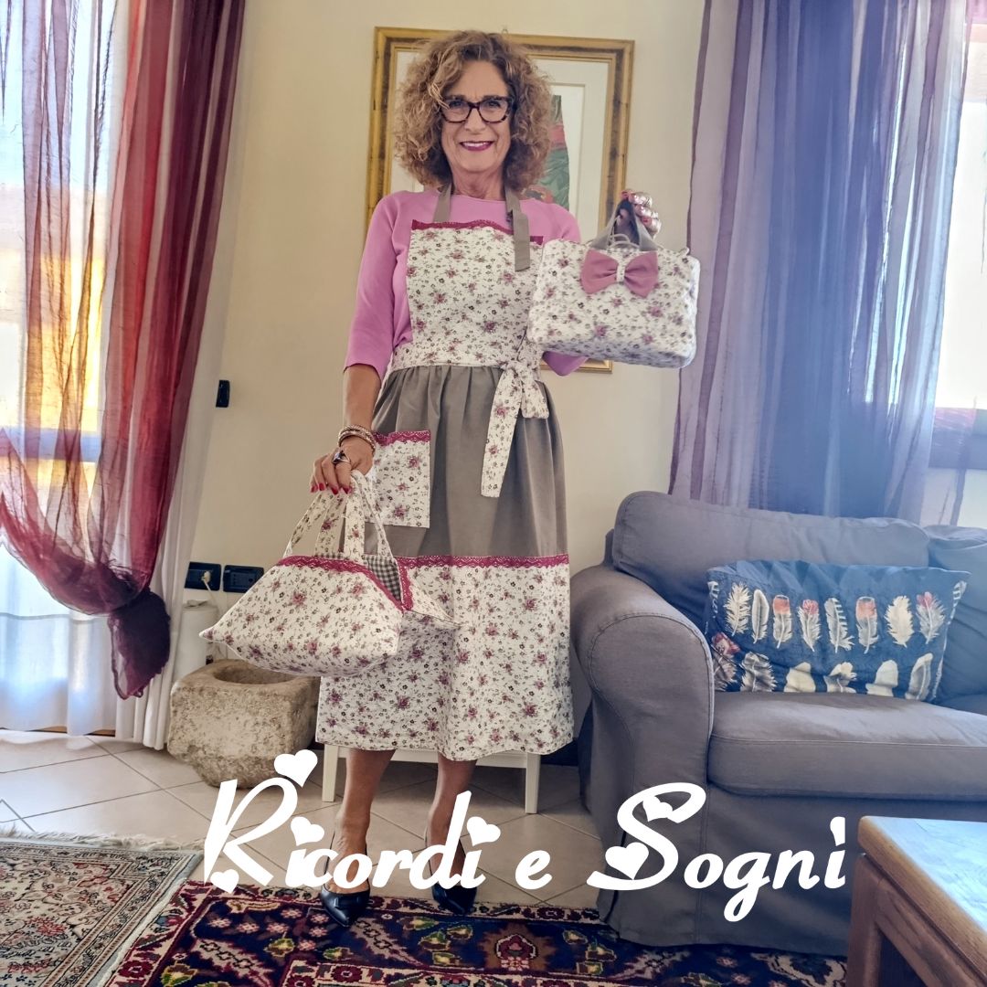 Gonna in misto cotone color tortora con inserti importanti (vedi abbassamento di cm 38) in panamino di cotone fantasia. Pettorina, tasca e abbassamento portano anche un pizzetto di puro cotone color bordeaux.
