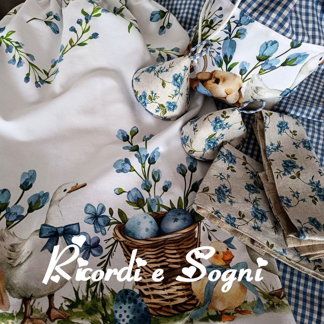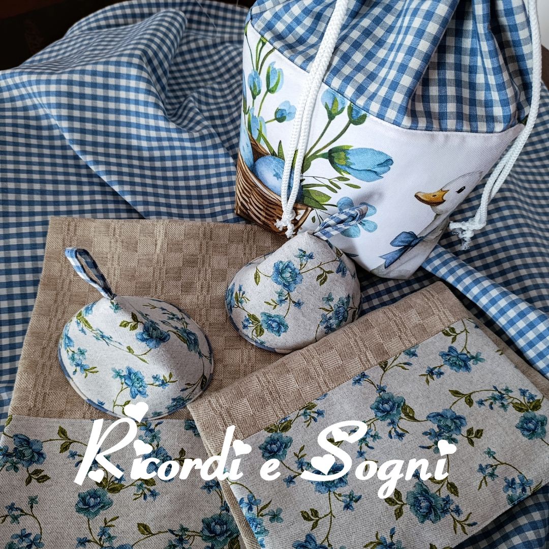 Esterno in panamino di cotone fantasia. Imbottitura mollettone sintetico. Interno in misto cotone a quadri bianco e azzurro carta da zucchero.