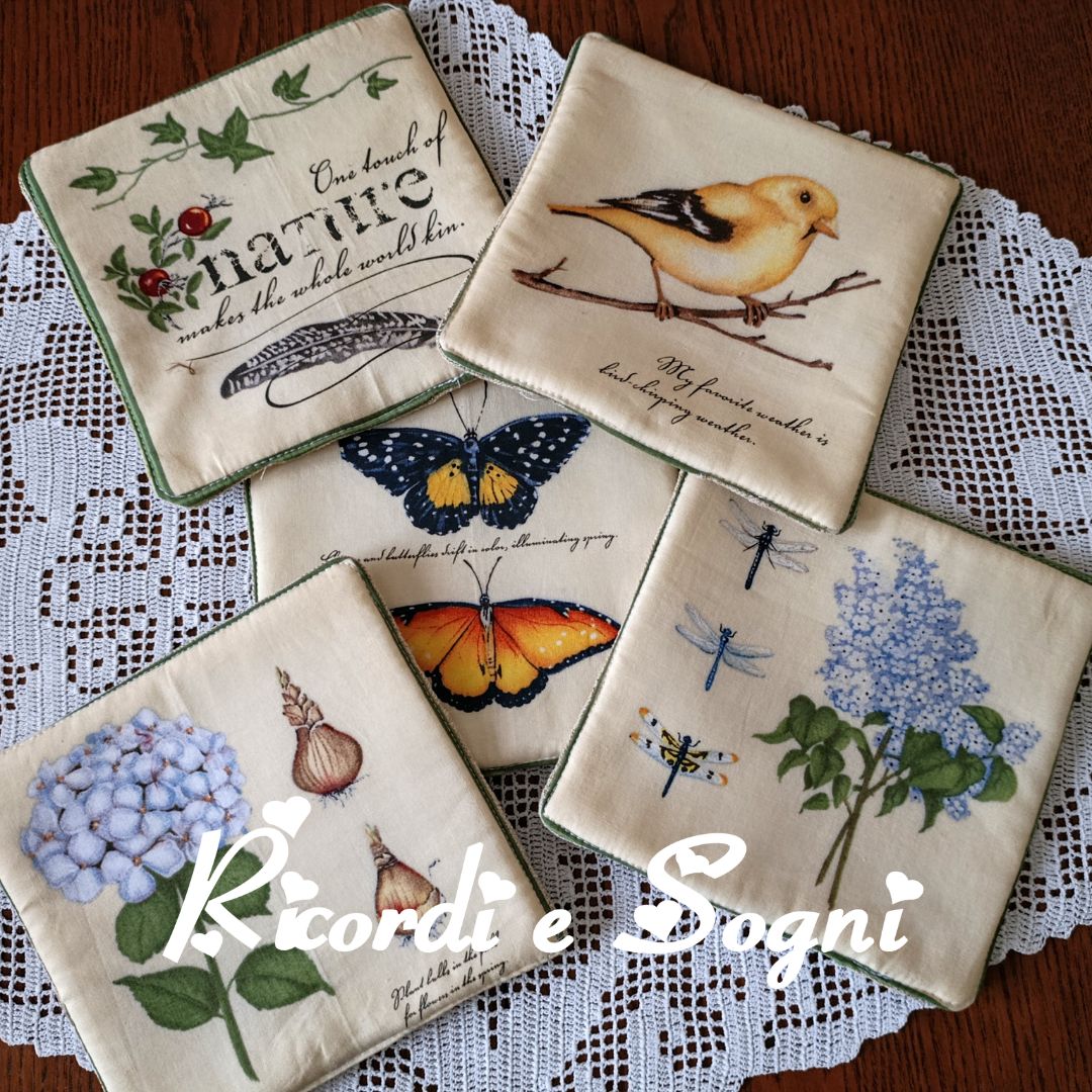 Gruppo di 5 presine a tema primaverile. Fronte in cotonina americana fantasia, retro in misto lino e canapa.