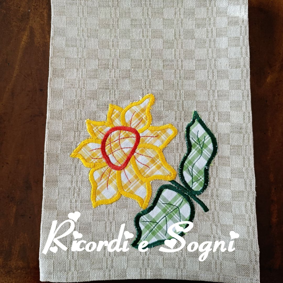 Asciugapiatti in lino e canapa di cm 53×70 con ricamo in appliquè di cm 19×18. Inserti in misto cotone.