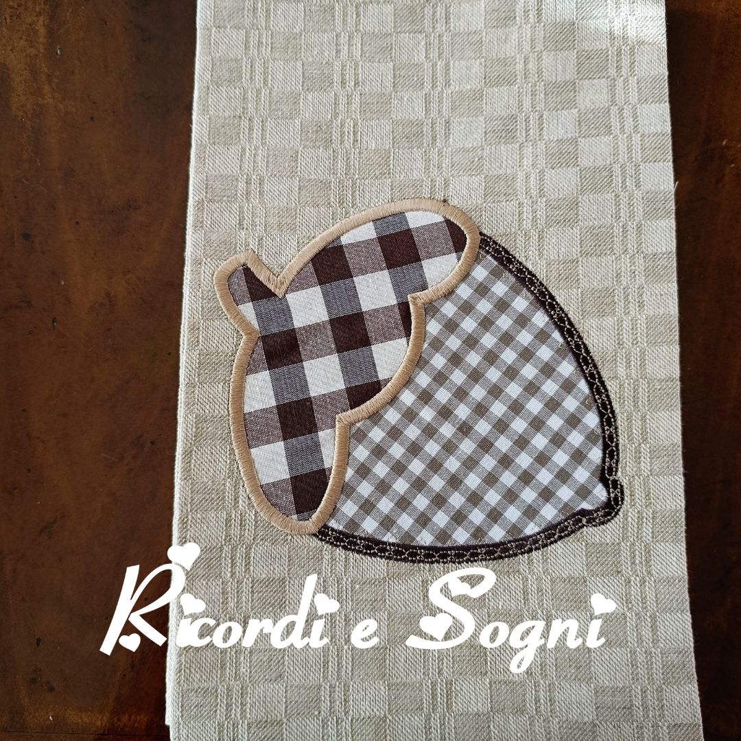 Asciugapiatti in lino e canapa di cm 53×70 con ricamo in appliquè di cm 18,5×16. Inserti in misto cotone.