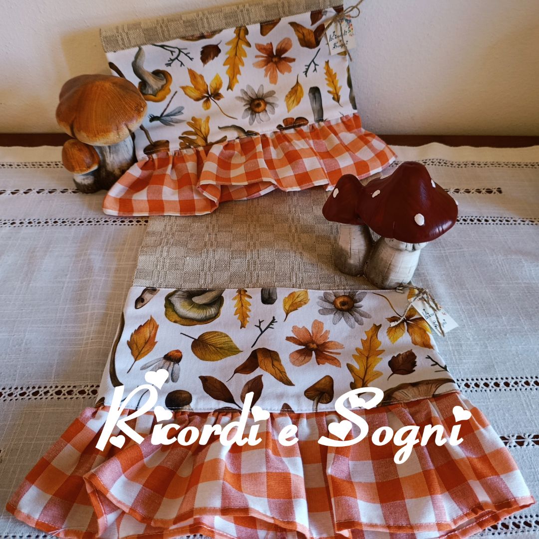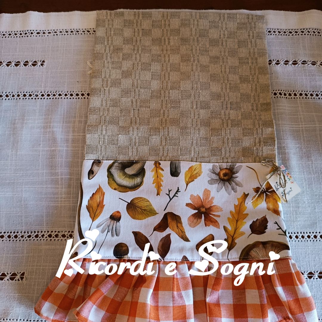 In lino e canapa misura cm 53×70 circa. Abbassamento in puro cotone fantasia di cm 12,5. Volant in misto cotone a quadri bianco e arancio di cm 8.