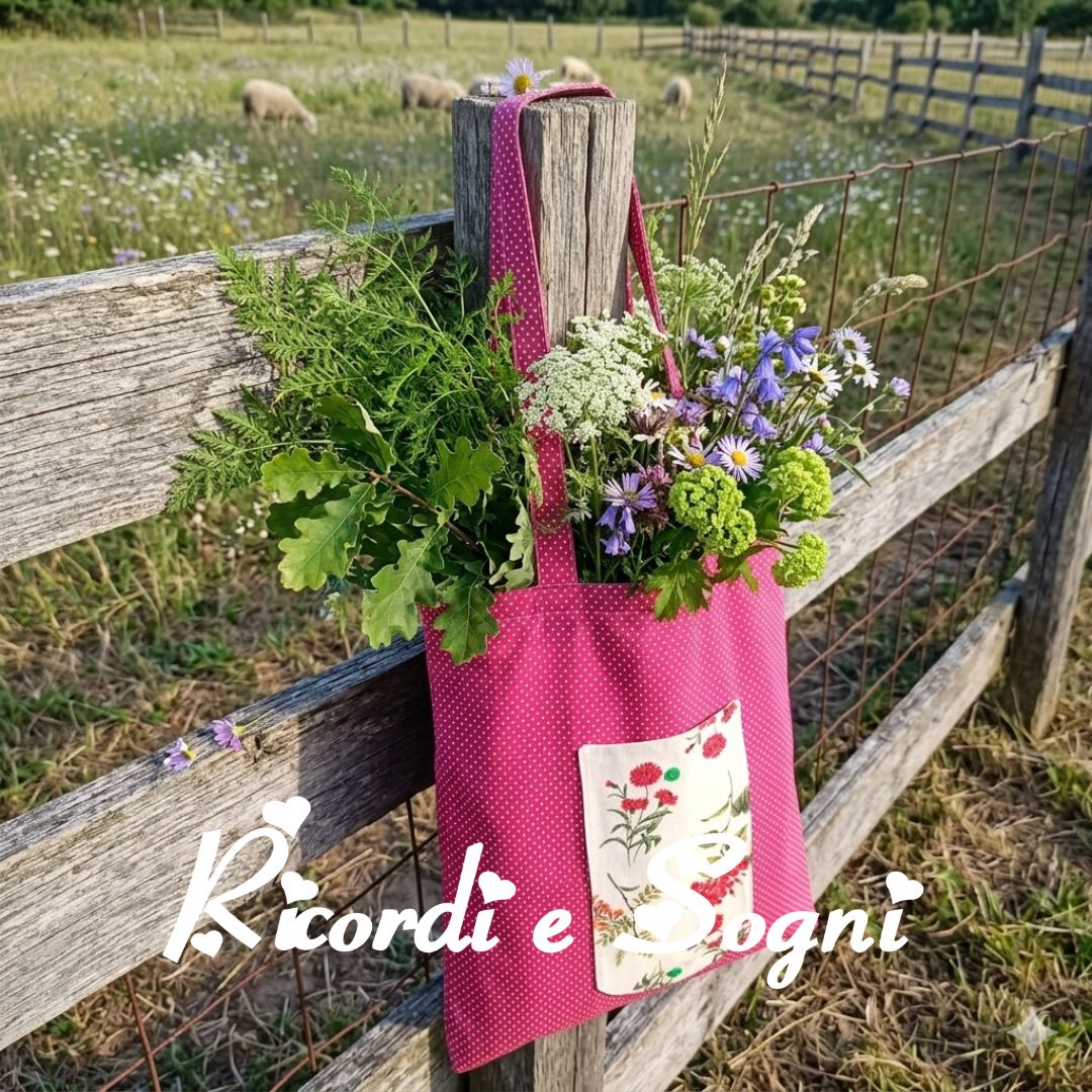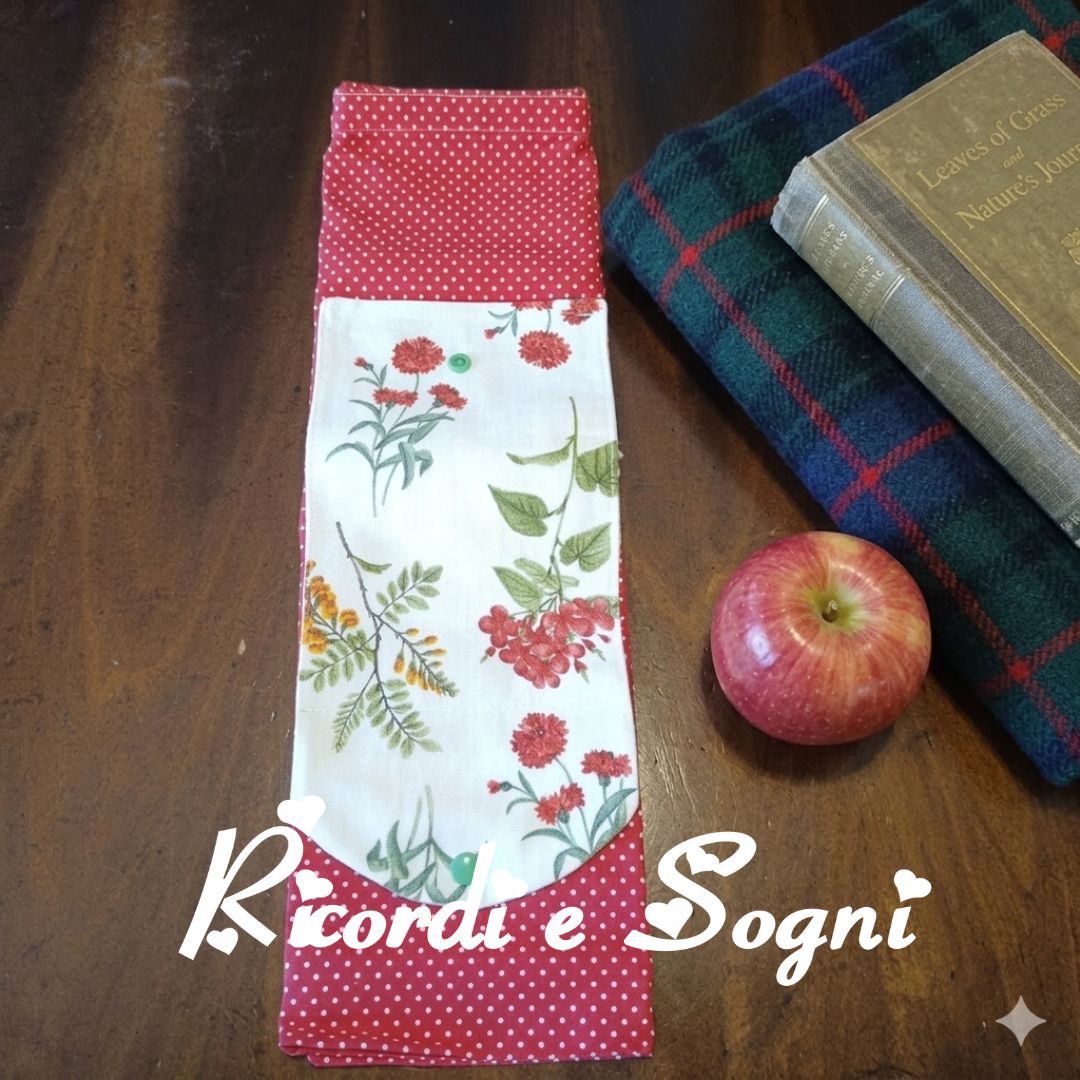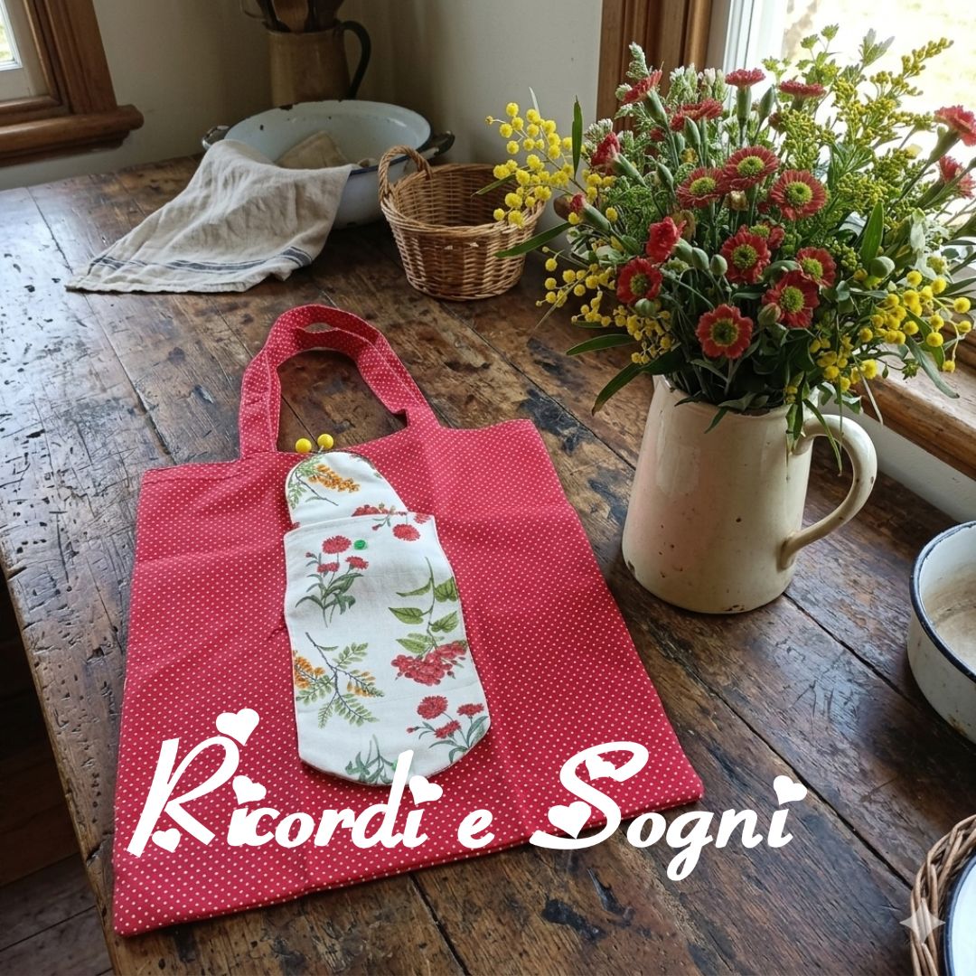 Borsa in puro cotone rosso a pois bianchi piccolissimi. La tasca in puro cotone color burro con fantasia fiorita misura cm 14×20 più la patella per la chiusura con bottoncino clic clac verde.